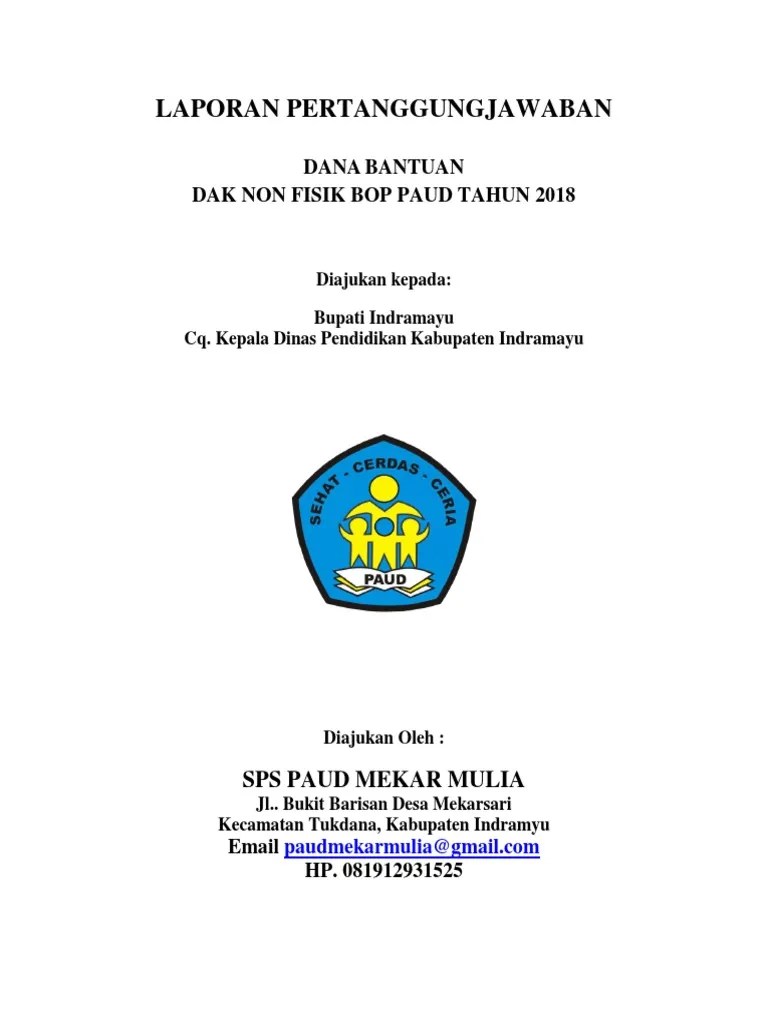 Laporan Paud : Buku Laporan Bulanan Sekolah Paud Format Word Operator Sekolah / Hasil penilaian dalam bentuk laporan perkembangan anak disampaikan kepada orang tua dalam kurun waktu semester.. Lampirkan fotokopi dokumen laporan keuangan tersebut. 14.09.2021 · media tentang data pokok pendidikan guru dan tenaga kependidikan indonesia serta informasi seputar pendididikan Sekaligus file ini untuk referensi bukti fisik akreditasi sd/mi standar isi khususnya. Pendidikan anak usia dini adalah suatu upaya pembinaan yang ditujukan kepada anak sejak lahir sampai dengan usia enam tahun yang dilakukan melalui pemberian rangsangan pendidikan untuk membantu pertumbuhan dan perkembangan jasmani dan rohani agar anak memiliki kesiapan dalam memasuki … 19.05.2014 · laporan ini disusun untuk memenuhi tugas mata kuliah analisis kegiatan pengembangan pendidikan anak usia dini (paud 4504) program s1 pgpaud fkip universitas terbuka.